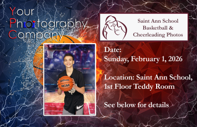 YPC (Your Photography Company) will be taking individual and team basketball photos and cheerleading photos on Sunday, February 1, 2026 at Saint Ann School. Pictures will be taken in the 1st floor Teddy Room. A photography schedule with the timeframe for your team’s individual photos will be provided shortly.